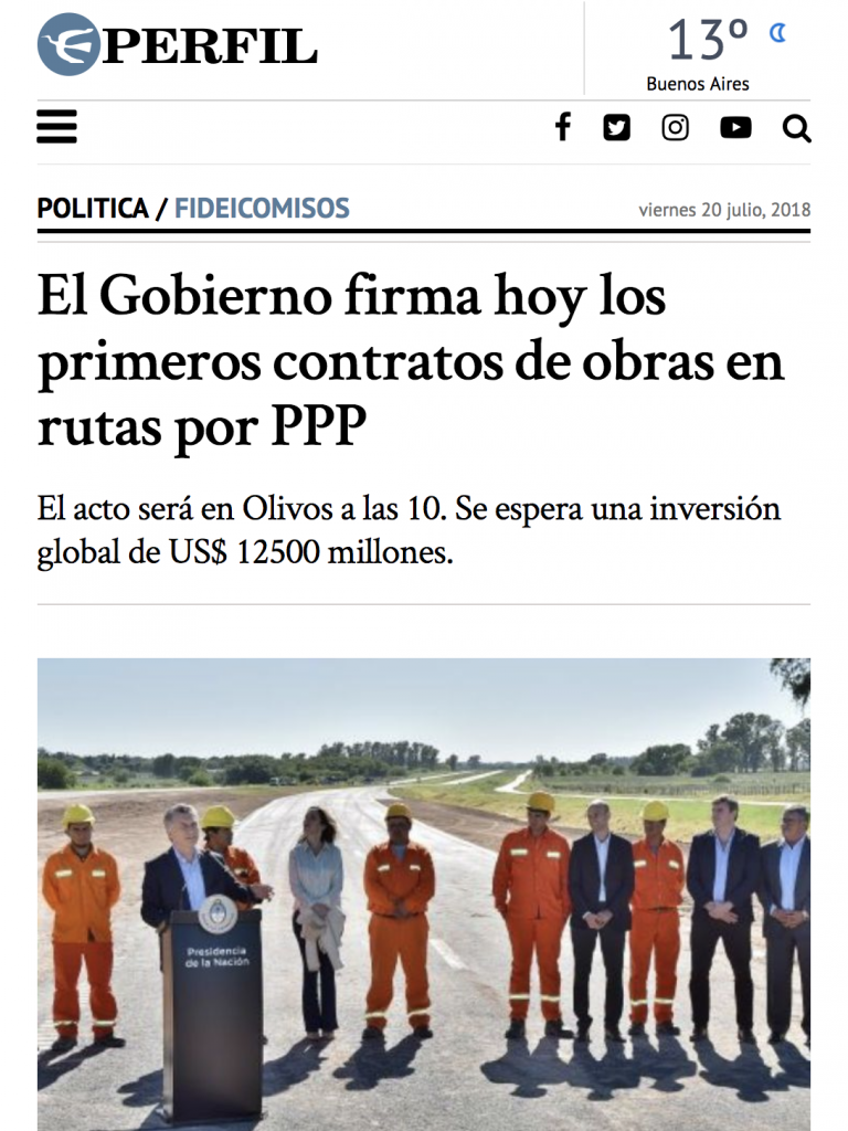 «Es un d?a hist?rico para la obra p?blica de nuestro pa?s. Firmamos los primeros contratos de Participaci?n P?blico Privada para transformar las rutas argentinas y que dejen de ser rutas de la muerte«, se?al? el titular de la cartera de Transporte.