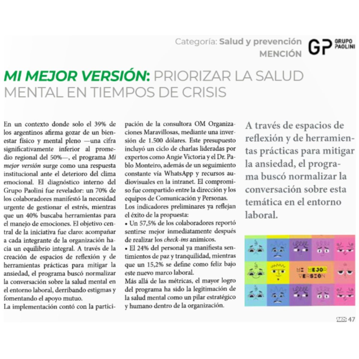 La mención especial corresponde a la categoría de Salud y Prevención se centra en el programa «Mi mejor versión», una respuesta institucional diseñada para priorizar la salud mental de nuestros colaboradores en tiempos de crisis.